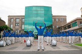 法轮功学员的表演,是游行队伍的压轴戏。司仪介绍了法轮功创始人李洪志先生,以及这个功法的一些特色。她说:「这个队伍是来自社会的各阶层,他们要将法轮大法『真、善、忍』的美好讯息,带给在场所有的来宾。」