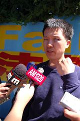 ![]() 受袭击的法轮功学员张春雨在回答媒体的提问。 |