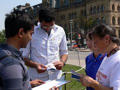 多伦多居民,酷刑受害者王鸿敏因坚持信仰曾被中共非法关押四次。王鸿敏在二十九日集会上讲述了自己的遭遇,“我被非法关押在朝阳拘留所时,受到了非人的折磨。我被罚站,不准睡觉。狱警指使犯人对我搜身,進行人格侮辱。他们兽性大发扒光我的衣服,对全身裸露的我拳打脚踢,使我当场晕倒在地。第二天,恶警又审讯、折磨我,并威胁,不准我炼功学法。我还看到恶警揪住另一女同修的头发拼命往铁门上撞,然后用电棍恶狠狠的电击她的头部和身体……”