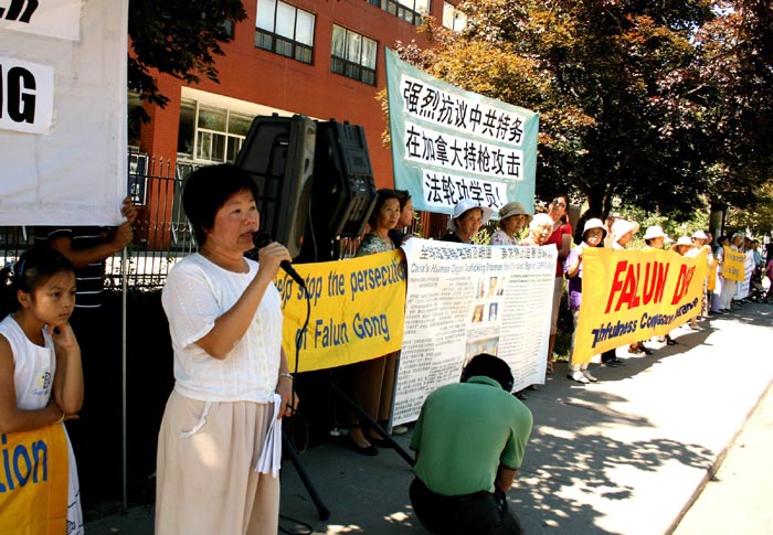 西人法轮功学员戴安娜(Diana)在会上发言说:“中共对海外法轮功学员的迫害八年来从未间断,除暴力殴打外,其它手段还包括电话骚扰、盗用学员电子邮件帐号散发病毒、骇客攻击法轮功网站、窃听电话、跟踪、向各国政府及华人社团施压,甚至围攻和骚扰支援法轮功的加拿大国会议员罗伯•安德斯(Rob Anders)等”。她强调:“加拿大是言论、信仰自由的国家,我们不能容许这样的暴力事件发生在加国土地上。”