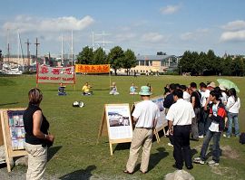 人群中也有一些中国人,他们不接资料,并态度蛮横。学员就耐心的用大量的事实和他们交谈,解开他们的心结。最后他们都沉默不语,低头表示认同。看着这些被中共党文化欺骗了的中国人,法轮功学员更感到责任重大,表示要加大力度坚持不懈的深入细致的讲真相。希望越来越多的民众都能早日觉醒。