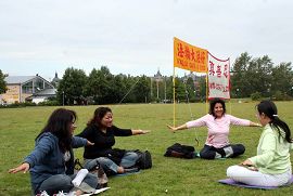 法轮功学员在活动中注意到,八年来形势在不断发生着变化。特别是来自大陆的中国游客,以前他们中的很多人通常会远远避开展位,不敢上前。如今,人们都主动的走到展板前观看、拍照,并和学员交谈,争相接真相资料。一位来自大陆的中年女士,对学员详细的讲述着她在部队当军官的丈夫被中共迫害的经过,讲述着他们生活在中共恶党统治下的那种痛苦压抑的生活。她说,她要把国外的真实情况带给国内的家人,她相信善有善报,恶有恶报的天理。还有俩位来自中国大陆南方的男士要学员帮他们照相,并说一定要把炼功的全部场面都照全,他要带回国让大伙好好看看!并风趣的说,耳听为虚,眼见为实嘛。最后他们说:“你们是我们的希望,加油啊!”他们都收下了“九评”和破网软件,高兴的离开。