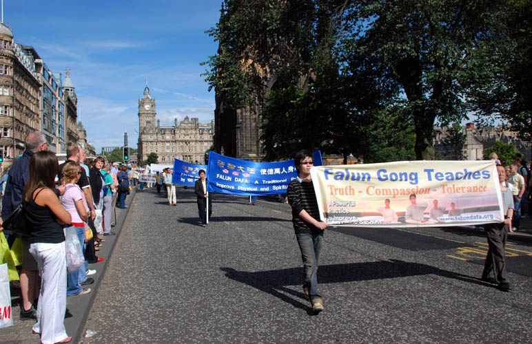 游行队伍经过爱丁堡著名的王子大街,行程数公里。因为爱丁堡国际艺术节即将开幕,市内汇集了来自世界各地的游客。游行的沿途,人们被天国乐团雄壮的演奏和声援退出中共横幅上的信息所吸引,纷纷驻足观看、倾听。天国乐团一百一十多位学员一路演奏着“法轮大法好”、“法鼓法号震十方”和“欢乐颂”,雄壮威严又充满慈悲的乐声将大法的福音送进了游人们的心里。