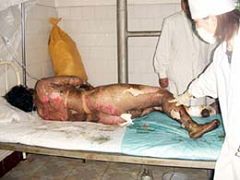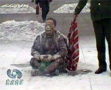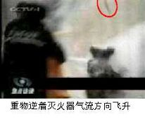 ![]() 天安门自焚伪案中自焚时的王进东 | ![]() 王进东两腿中间装满汽油的塑料雪碧瓶居然完好无损 |