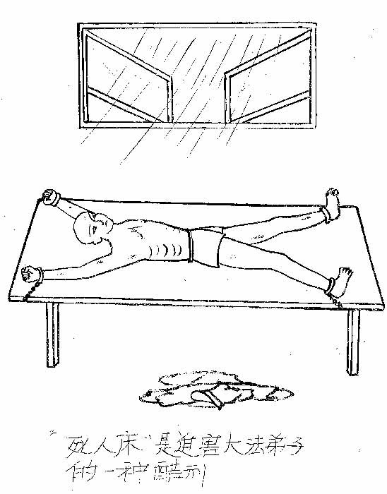 在原四监区,法轮功学员杨慧勇也因各种不公正待遇和抵制奴役劳动,不但被原看守大队恶警队长赫庆国关入小号进行迫害,还给他上固定床(死人床),并唆使其他恶警一起同时用九根上万伏的电棍电击杨慧勇,致使杨慧勇当时就被电昏死过去。还有法轮功学员付宏伟也遭受此种酷刑迫害。