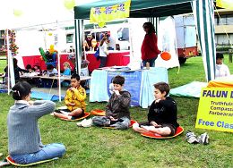 人们纷纷到法轮功学员的摊位拿资料,并签名声援反迫害。有趣的是,一大早,三位前几年来学过功的小朋友,又来到摊位。其中一位小孩的爸爸也来了,他说去年他儿子学完法轮功后,就回家与他分享炼功的感受。这三位小朋友再一次兴高采烈的学炼功法,并表示下午再来。