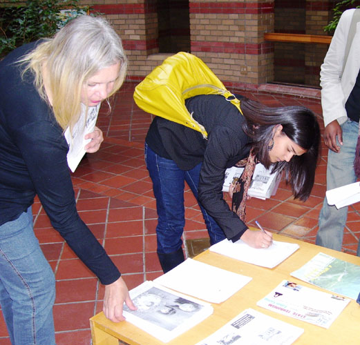 西开普大学学生参观画展时,都对画中揭露的中共对法轮功学员的迫害与酷刑深表惊讶。有的说:不敢想象,在当今的中国还有这样的事?!有的问:为什么这样的迫害会在中国发生?法轮功学员向学生们解释了中共的邪恶本质决定了它无法容忍上亿民众对“真善忍”的信仰。同学们听后,都深表对受迫害法轮功学员的同情,并纷纷在签名簿上签名声援反迫害。