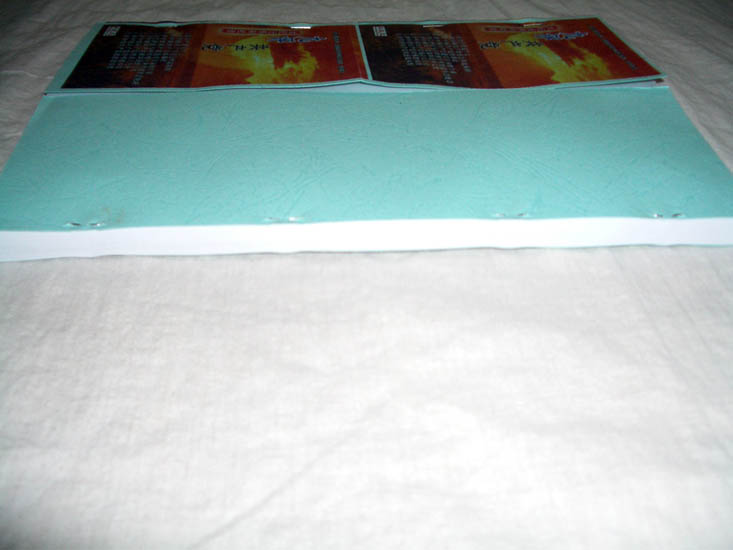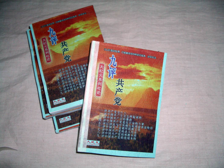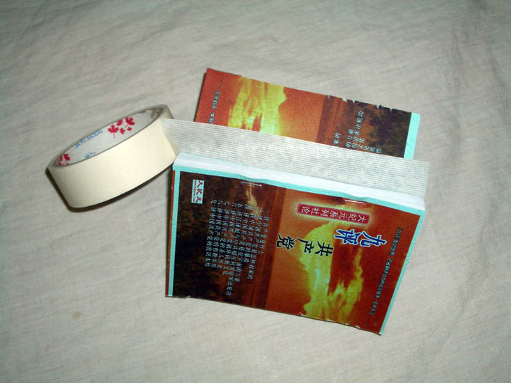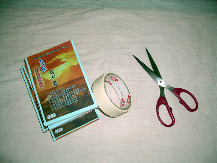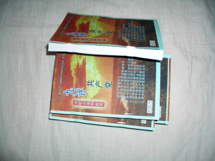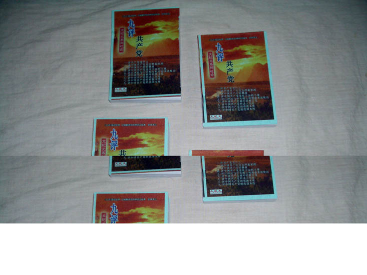 先将打印好的《九评》连同封面一起用装订机装订,钉脚一定要锤平。用切纸刀切好,书的背脊处是裸露的。然后用分色纸将背脊处粘贴好,就可以了。也可仿照文具店软面抄的做法。
