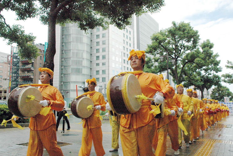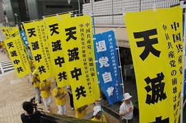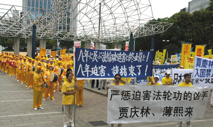 前一天,两位法轮功学员在大阪提交诉状控告贾庆林后,声援者在大阪也举行了游行。