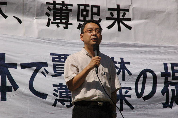 ![]() 兵库县前加古川市议会议员大矢卓志在集会上发言。 |