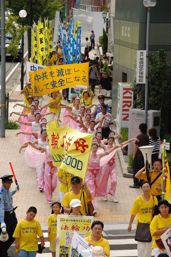 游行由四个主题的队列组成:反迫害控告贾庆林、腰鼓镇邪、法轮大法好,以及天灭中共退党自救。游行队伍在神户主要街道穿越了近三个小时,并通过中华街附近的繁华商店街。法轮功学员的腰鼓队威风凛凛,队员们亦有不少老人和孩子,令路人刮目相看。长长的游行队伍布满了主要道路的人行道和天桥,颇为壮观。