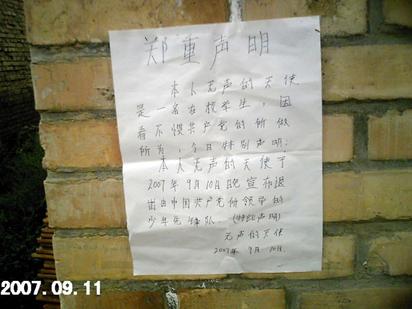 【明慧网二零零七年九月十九日】前天早上我走在甘肃省某县的一个巷道里,发现砖墙上贴着一张白纸,走近一看是一份退队声明,是一个小朋友写的,写的非常好,化名“无声的天使”,这名字我也觉的真好听,我真为这小朋友感到高兴。