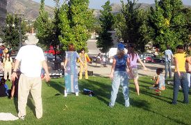 那位印地安人讲述完他们的预言,便轮到了法轮大法的介绍时间。法轮功学员拿着画有法轮的大旗走上了讲台,向人们介绍了法轮大法的来源和现在在世界上洪传的情况。