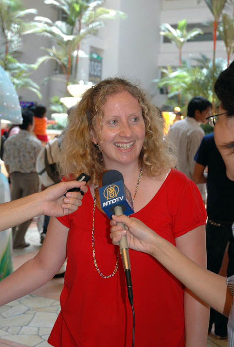 英国的游客罗拉非常喜爱法轮功学员的腰鼓表演