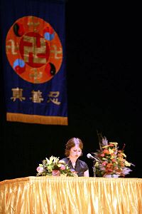 在法会的开幕词中这样写道:过去八年的风风雨雨,面对世人的不解,我们没有放弃,面对中共邪恶的迫害,我们没有退缩,新年晚会的钟声催促着世人的觉醒,退党大潮预示着“正义终将战胜邪恶”,让我们以此为契机,互相勉励,共同精進,法轮大法的真相终将走進世界的每个角落。