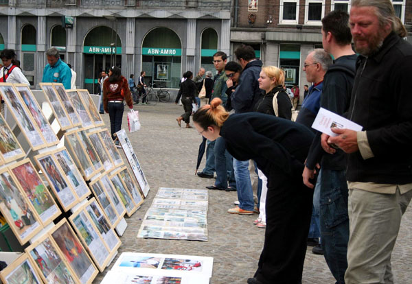 二零零五年三月二十日下午,荷兰法轮功学员在阿姆斯特丹的水坝广场(Dam Square)举办反酷刑展,揭露在中国江氏集团对法轮功学员的残酷迫害。