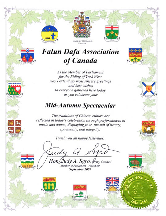 ![]() 多伦多市约克西区国会议员朱迪•思格若(Judy Sgro)的贺信 |