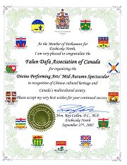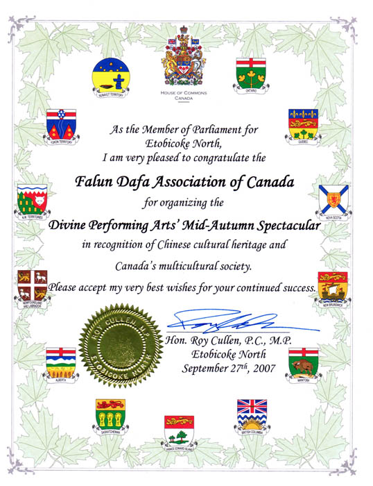 ![]() 多伦多市Etobicoke北区国会议员罗伊-卡伦(Roy Cullen)的贺信 |