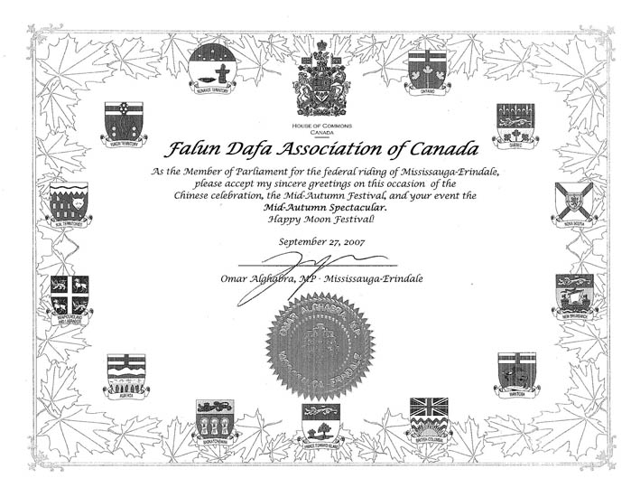 ![]() 大多伦多地区密西沙加Erindale国会议员Omar Alghabra的贺信 |