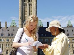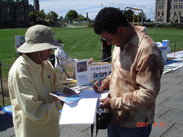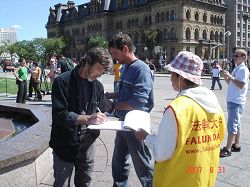 【明慧网二零零七年九月三日】(明慧记者英梓加拿大报道)二零零七年九月初,加拿大总理将出席在澳大利亚举行的APEC会议。为了呼吁总理在这次会议上向中国领导人提出停止迫害法轮功,停止活体摘取法轮功学员器官和营救十六名加拿大人的亲属,来自加东地区的法轮功学员在加拿大国会山前、人权纪念碑、购物中心等地举行了为期一周的酷刑展和征签活动,向广大民众讲真相