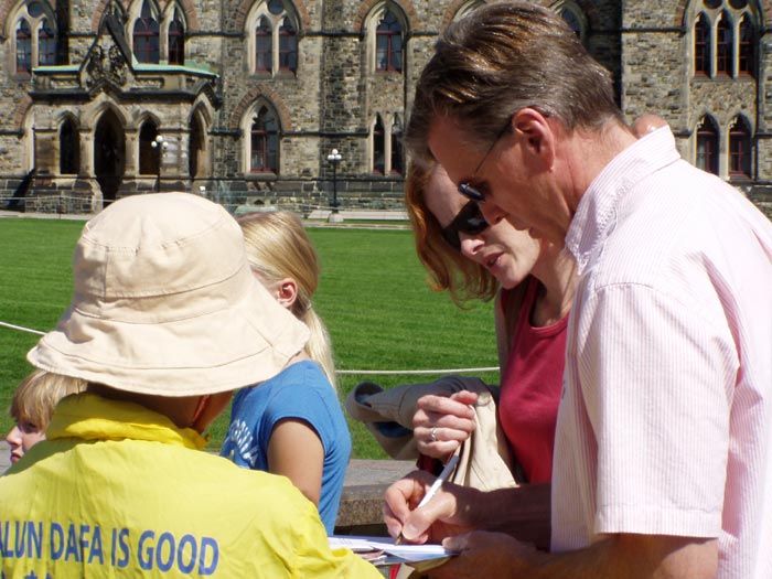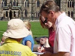 明白真相的民众主动签请愿信,据法轮功学员介绍,每天都能征集到数百个来自加拿大各地民众的签名。他们发自内心的为这些善良的生命感到高兴。