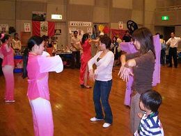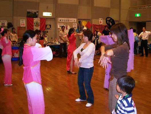 ![]() 主办单位请法轮功学员现场教功,许多观众都要求学炼功法 |