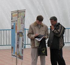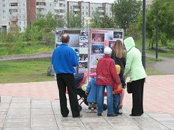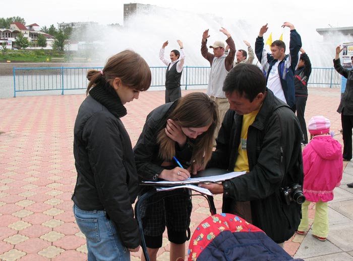 有意思的是在阿巴干的上一次小型洪法讲真相活动中,按照俄罗斯法律,当地的警察有责任在这样的活动中在场维持秩序以免有什么不良之徒或者酒鬼在场滋事,因此有不为数不少的警察一直在场到活动结束。而这一次,规模和人数都较上一次大且多,还有数个城市前来的法轮功学员,但维持秩序的警察却一个也没来。据阿巴干法轮功学员讲,因为上一次活动从头到尾平和安详,井然有序,学员静静的炼功、平和的向世人讲真相,热情礼貌的散发资料,向世人也向前来维持秩序的警察们展示了法轮大法的祥和和美好;世人也同样安静礼貌,有兴趣的就上前观看大型的图文并茂的展板,再有的就提出一些问题;有的当场就试着和学员一起学着炼起功来,还有的当场就索要书籍和资料要回家進行研读。警察们觉的确实没有必要再来维持什么,也就干脆不来了。