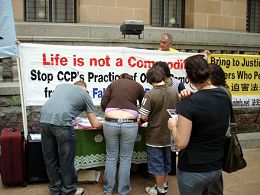过往行人前来了解法轮功真相之后,主动在制止迫害的请愿书上签字。