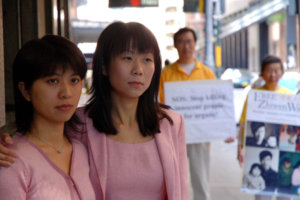 ![]() 王晓丹与被关押在上海市女子监狱法轮功学员曾爱华的女儿、悉尼居民陈慕涵在新闻发布会后接受专访。 |