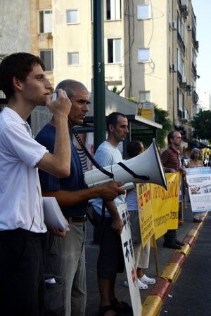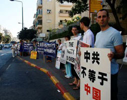 【明慧网二零零七年九月六日】二零零七年八月二十八日,在位于特拉维夫的中共驻以色列使馆对面,以色列各界人士举行了集会,声援两千五百万中国民众退出邪恶中共的党团队组织。与会人士打出“天灭中共”、“退党自救”、“中共不等于中国”等横幅标语,向世人昭示中共即将灭亡的天象,呼吁中共使馆内外的中国人尽快认清中共邪灵的本质,早日三退(退出中共党团队),远离灾难。