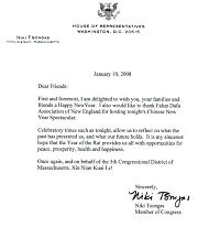 在二零零八年新唐人全球华人新年晚会即将在波士顿上演之际,美国麻州第五区国会议员妮姬•桑格斯致函新英格兰法轮大法协会,祝晚会成功。