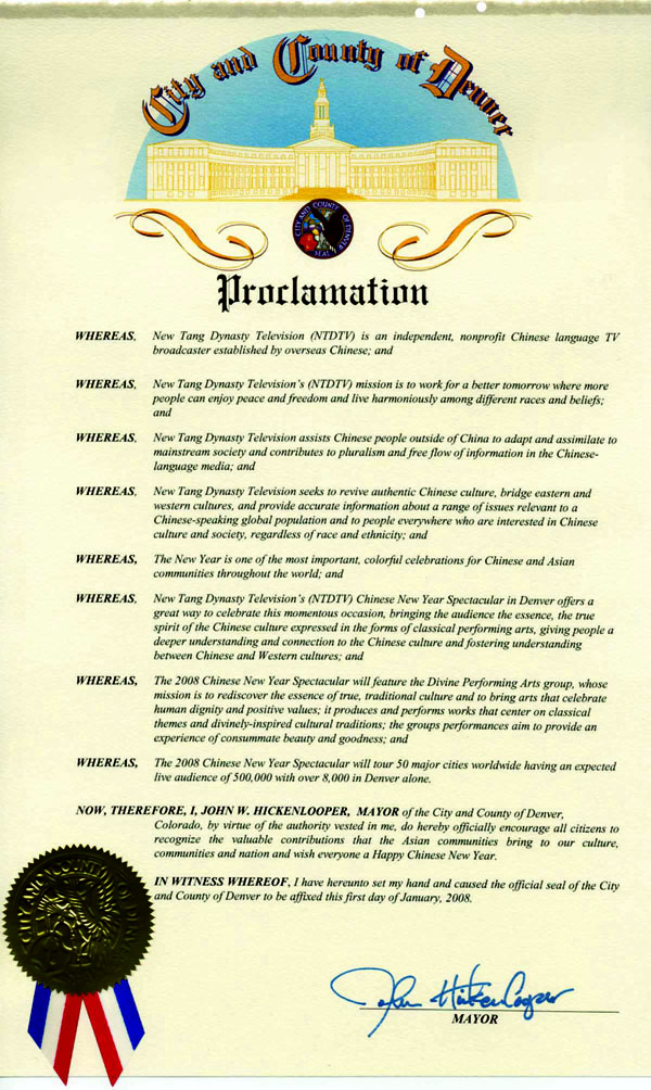 【明慧网二零零八年一月十日】由神韵纽约巡回艺术团担纲的全球华人新年晚会即将于二零零八年一月十一、十二、十三日,在科罗拉多州丹佛市上演,丹佛市市长致信褒奖主办单位新唐人及晚会。以下是丹佛市市长约翰•西根陆坡(John W. Hickenlooper)的褒奖函: