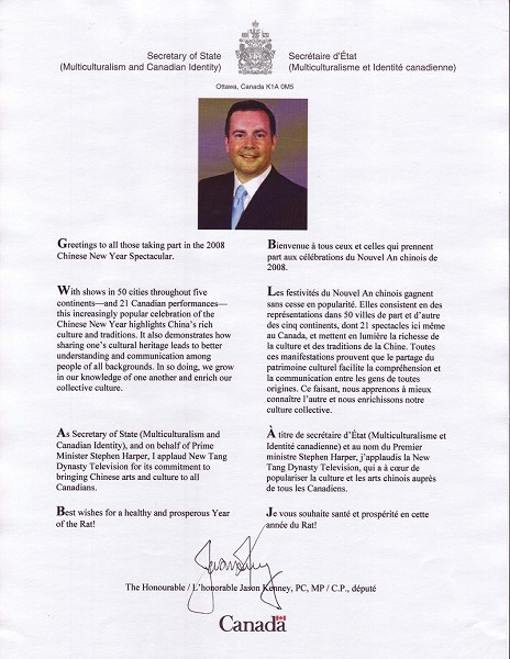 多元文化部部长杰森•肯尼(Jason Kenney)在他的贺信中表示,作为加拿大多元文化部长,他代表斯蒂文•哈珀总理,为新唐人电视台所承担的责任和努力,将中国的传统文化和艺术带给加拿大而喝彩。