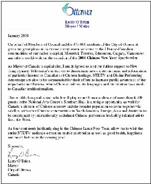 渥太华市长拉里•欧布里安(Larry O’Brien)在他给晚会的贺信中表示,这场将在国家艺术中心Southam Hall呈现给四千两百多名观众的世界级演出“提供了一个独特的机会,使得华人们能共同欣赏国际著名的中外艺术家的世界一流的精彩表演”。