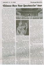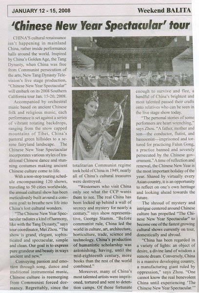 文章开篇是这样描述的:中国文化的复兴不是发生在中国大陆,而是发生在世界各地的演出大厅里。受中国黄金时代唐朝(中国文艺没有遭到共产党迫害的时代)的启发,新唐人电视台推出的现场舞台制作“全球华人新年晚会”,将于二零零八年一月十五日至二十日巡回至南加州。