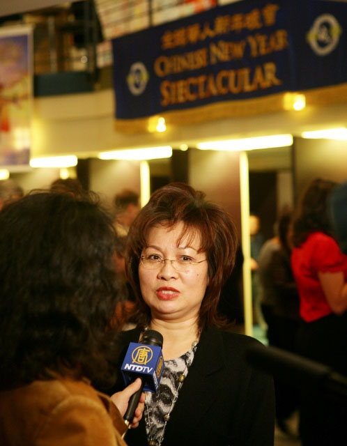 她说,“晚会的舞蹈动作非常的漂亮,配上很漂亮的服装——因为这服装是特别设计的,可以看得出来。”她认为整个晚会的故事内容也很感人,“教人要行善,要孝顺父母、忠于国家”,“这些都在舞蹈的动作和演员的表情中表现出来了,(令人)很感动,很喜欢。”