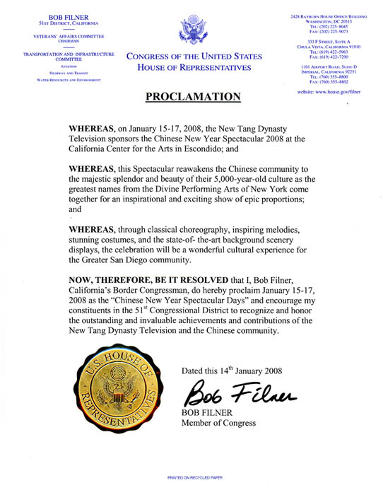 因此,我,鲍伯•费尔纳,加州边境地区的联邦众议员,郑重宣布二零零八年一月十五日至十七日为「华人新年晚会日」,并鼓励我所管辖的第五十一选区的选民认可并尊重新唐人电视台和华人社区所作出的非凡、杰出的成就与贡献。