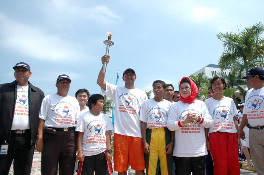 ![]() 丽耀(Riau)群岛首长夫人及当地政要出席在巴淡中心举行的「人权圣火」抵达巴淡岛仪式 |