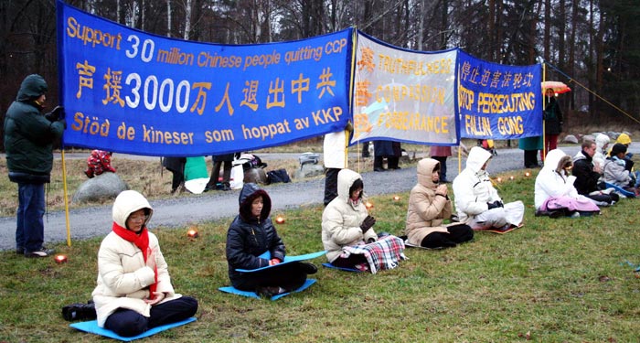 【明慧网二零零八年一月二日】圣诞假期是西方人一年一度家庭团聚、好友相会的日子。圣诞节刚过,十二月二十九日,部份北欧法轮大法修炼者相聚在瑞典首都斯德哥尔摩的中共使馆前,他们在这里点燃烛光静坐,抗议中共邪党对法轮大法的残酷迫害
