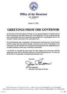 ![]() 内华达州长吉本斯发来贺信,热烈欢迎神韵艺术演出团的到来,称将怀着激动的心情见证这个注定成功的晚会 | ![]() 内华达州长吉本斯的贺信原文 |