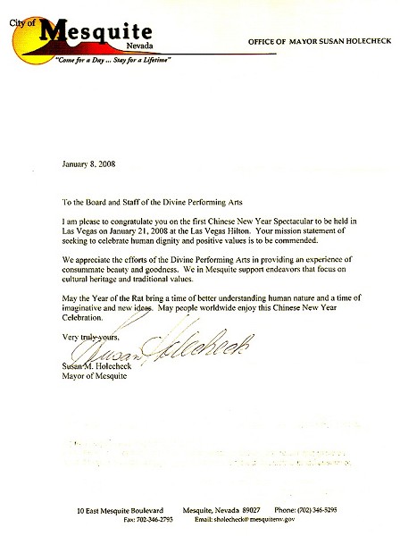 内华达州马斯奎特市(Mesquite)市长苏珊•霍尔切克(Susan Holecheck)给神韵艺术团的演员和工作人员发来贺信,赞扬神韵艺术团为褒扬人类高尚品格和正面价值所做出的努力。