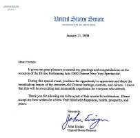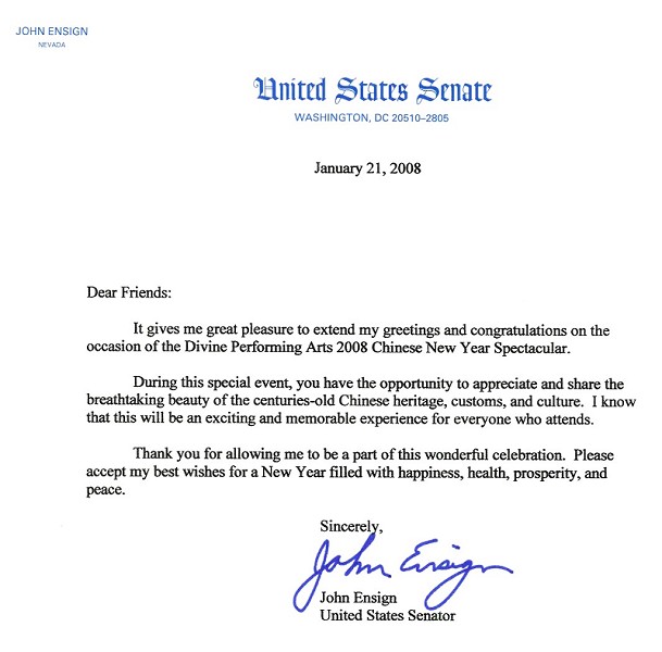 内华达州联邦参议员约翰•恩赛(John Ensign)在给晚会的贺电中表示:“我感到非常荣幸能在神韵艺术团二零零八年全球华人新年晚会演出期间致以问候与祝贺。在神韵演出期间,我们将得到一个可以欣赏和分享美丽灿烂中国古老文化的良机,我知道这对每一个来看演出的人来说都将是一个兴奋而难忘的新体验。”