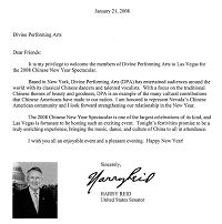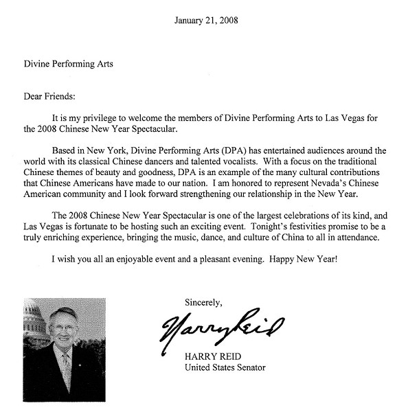 内华达州联邦参议员哈利•瑞德(Harry Reid)在贺信中说:“神韵艺术团以一流的舞蹈家和有才赋的声乐家,使全世界的观众感到欢愉。聚焦于传统中国文化的美妙和优良,神韵艺术团是华裔为美国多元文化做出贡献的楷模。我以能够为内华达州的华裔褒奖而感到光荣,并且我期待能在新的一年里更加增强我们之间的友谊。”