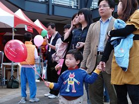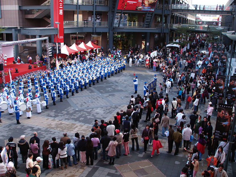 假日的信义区香榭大道广场热闹非凡,其中一群由一百二十人组成、身着中国古装服饰的天国乐团以及随后的新唐人旗鼓队吸引众人目光。
