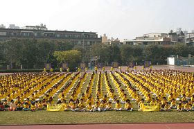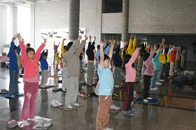 交流会中也设立儿童组,分大班、小班、幼幼班,由几位有经验的学员带领一百多位小弟子,大家一起炼功、学法,做游戏。