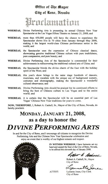 因而,此时此刻,我,罗伯特•凯塞尔,内华达州雷诺市市长,在此宣布:二零零八年一月二十一日,星期一,为神韵艺术团荣誉日。