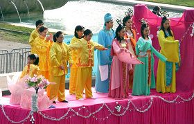 ![]() 优美祥和的法轮功功法表演与唐装展示 |
