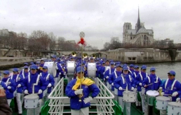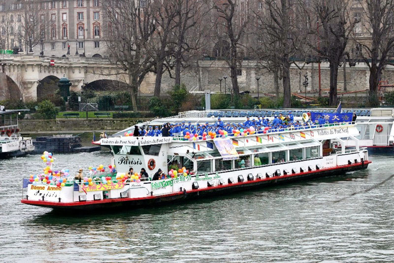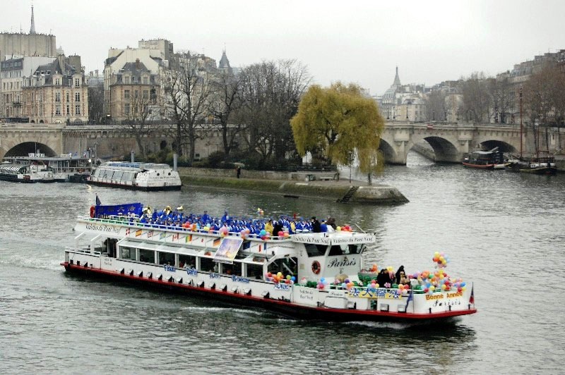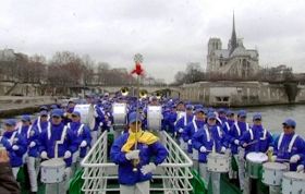 由一百二十多名来自欧洲各国不同族裔的法轮功学员组成的欧洲天国乐团乘坐塞纳河上“新桥之星”游船,沿途演奏雄壮、欢快的乐曲--“法轮大法好”、“送宝”、“法鼓法号震乾坤”、“法正乾坤”和脍炙人口的贝多芬的“欢乐颂”。