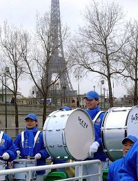 【明慧网二零零八年一月三日】二零零八年第一天,法国法轮大法协会应邀参加了“巴黎游行节(The Paris Parade Festival)”在法国巴黎举办的一年一度的新年军乐团表演,地点是与埃菲尔铁塔隔河相望的另一旅游者必去的景点:自由与人权广场——下方的喷水池。新年伊始,欧洲法轮功学员用音乐、舞蹈和功法表演等多种形式把法轮大法的美好和新年祝福带给了成千上万的巴黎人和来自世界各地的游人。