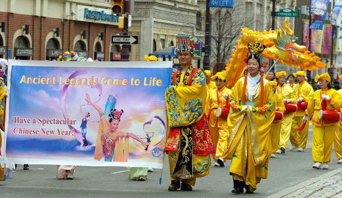 法轮功学员组成的队伍今年的主题是“古老传说降临人间(Ancient Legends Come to Life)”。“皇帝”、“皇后”带领着中国传统的腰鼓队、舞龙和舞狮子走在百老汇大街上,向人们展示着中国古老的传统文化,迎接将于一月四日至六日在百老汇街美丽安剧院上演的新唐人全球华人新年晚会,一起欢庆新年。